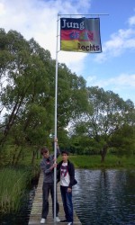 Fahnenmast mit der Flagge “Jung gegen Rechts“ auf dem Kinn balancieren.