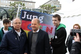 Bei der großen Kundgebung gegen Rechts unter dem Motto "Hamburg bekennt Farbe" am 2. Juni 2012 auf dem Rathausmarkt trafen sich die Initiatoren von "Jung gegen Rechts" Max-Fabian Wolff Jürgens und Jamal Gharez mit dem 1. Bürgermeister der Hansestadt, Olaf Scholz (v.r.) und mit dem Präsidenten des Zentralrats der Juden in Deutschland, Dr. Dieter Graumann (v.l.).