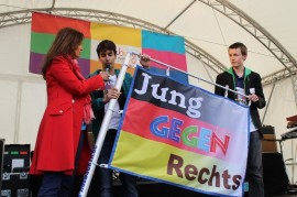 Auf der Bühne von "Hamburg bekennt Farbe" berichteten Max-Fabian und Jamal der NDR-Moderatorin Julia Niharika Sen über ihr Projekt "Reise gegen Rechts", das sie am 23. Mai in der Sendung "Gottschalk Live" vorgestellt hatten. Rund 3000 Teilnehmern der Gegendemonstration auf dem Rathausmarkt waren begeistert von der Initiative der Gymnasiasten aus Kyritz in Brandenburg.