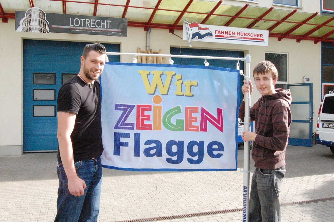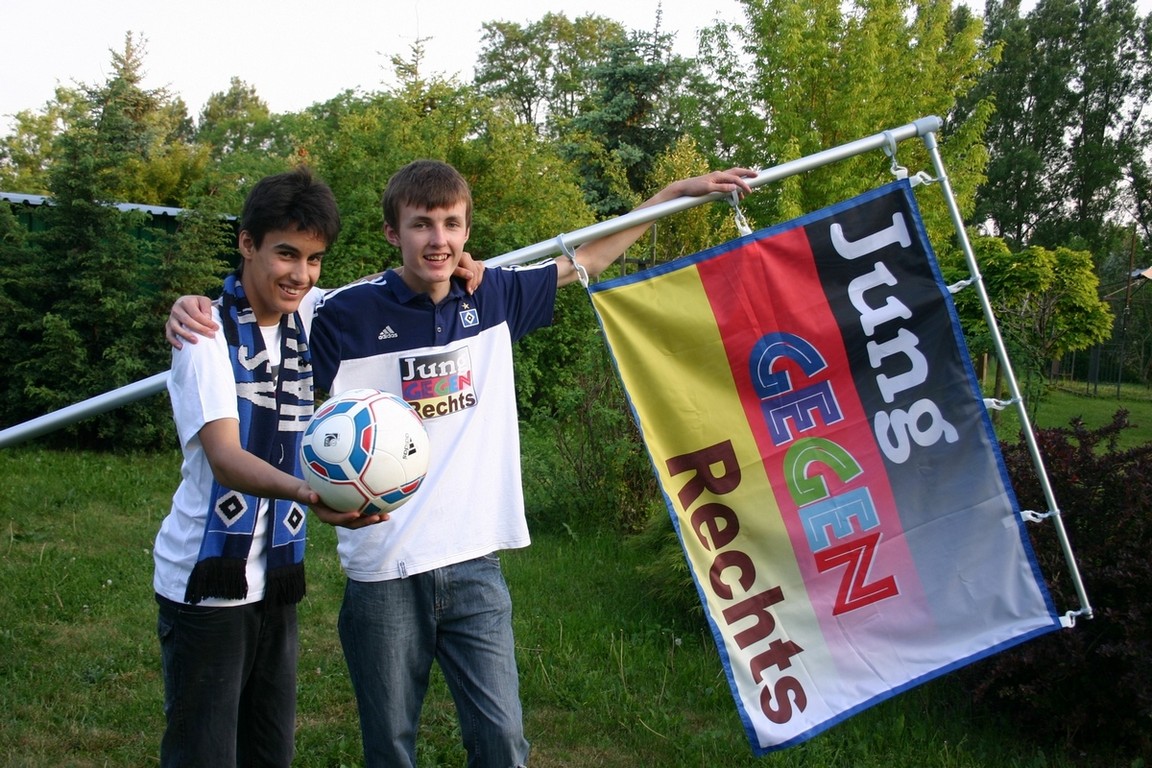 Nicht nur mit ihrer Flagge "Jung gegen Rechts" wollen Max-Fabian (rechts) und sein Freund und Mitschüler Jamal ein weithin sichtbares Zeichen gegen Rechtsextremismus, Intoleranz und Fremdenfeindlichkeit setzen.