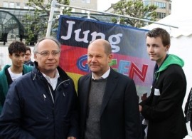 Bei der Kundgebung "Hamburg bekennt Farbe" am 2. Juni trafen die beiden Gymnasiasten u.a. den 1. Bürgermeister Olaf Scholz (Mitte) und den Präsidenten des Zentralrats der Juden, Dr. Dieter Graumann.