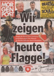 Auf dem Titelbild der Hamburger Morgenpost zeigten Prominente wie Helmut Schmidt, Udo Lindenberg und Tim Mälzer Flagge gegen den geplanten Neonazi-Aufmarsch in Hamburg.