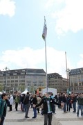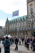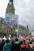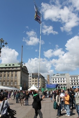 Max-Fabian und Jamal setzten die Symbolik in die Tat um und brachten einen sechs Meter hohen Fahnenmast mit zur großen Kundgebung "Hamburg bekennt Farbe" auf den Rathausmarkt, den Max-Fabian zeitweise auch auf seinem Kinn balancierte. Dort fanden Sie mit ihrer Aktion Beachtung bei Jung und Alt, bei Bürgern, Politikern und Prominenten.